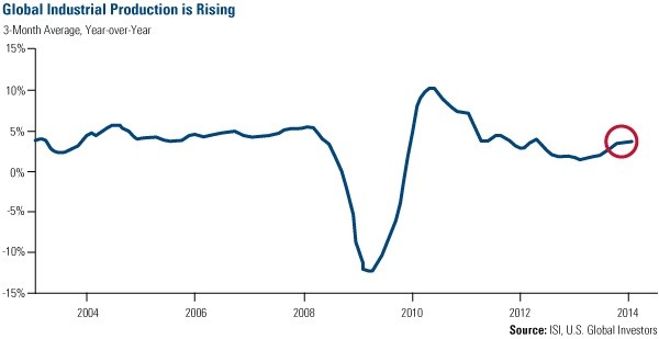 1) The rate of change of global industrial production (IP) was slowing until the close of 2013. Now, however, the global growth outlook is improving. You can see that an inflection point was hit in mid-2013, reaccelerating IP and coinciding with the global GDP outlook for 2014.