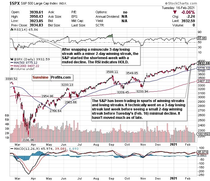 Before Tuesday’s (Feb. 16) “decline” (if you can call it that), here’s how the S&P has traded in February. It kicked off the month by ripping off a streak of gains in 6 of 7 days. It then promptly went on a 3-day losing streak, followed by a two-day winning streak and more record closes.