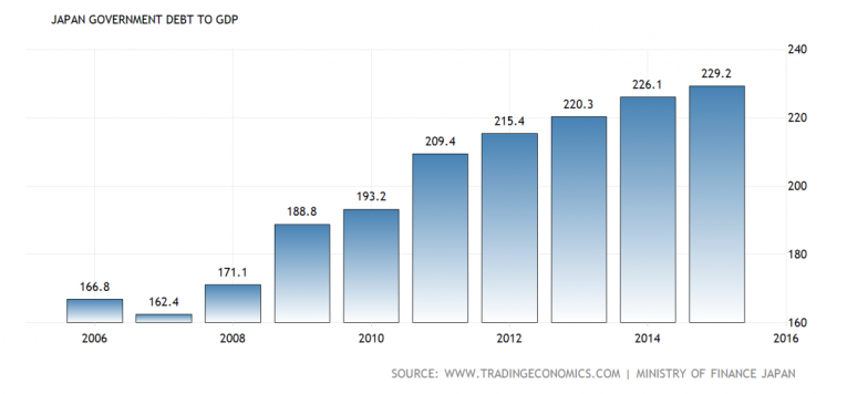 And then we have Japan, the island nation has spent the past 25 years deploying one government stimulus program after another to no avail. With a Government Debt to GDP ratio nearing 230%, it's hard to imagine that increased deficit spending now is going to break new ground, or turn this scary trend around.