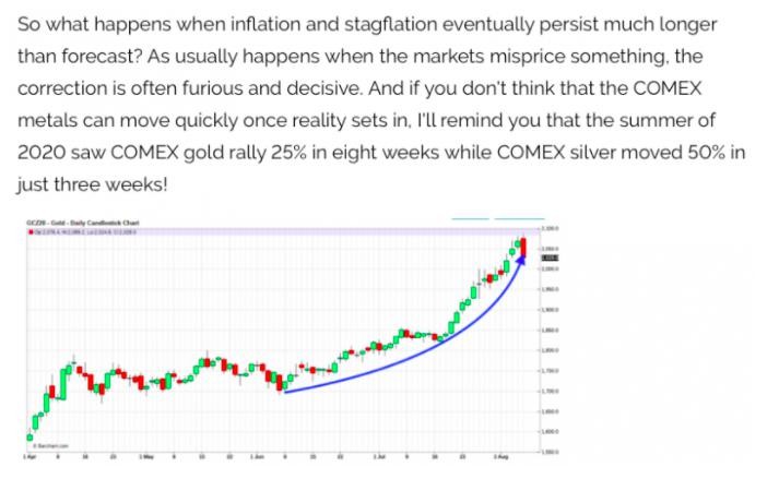 And when "investors catch on", the move upward in COMEX gold is very likely to be gradual and then sudden. Rob McEwen suggests a price as high as $3000/ounce, but that's not a likely first target. Instead, look for COMEX gold to eventually overshoot its most recent all-time high by 10% or so—just as it did in August 2020 when it peaked at $2080 versus the September 2011 high of $1920. This is precisely what we laid out in our annual macrocast when it was released back in January. While the timing may have been off, the message and rationale were not. 2021: A Gold Odyssey
