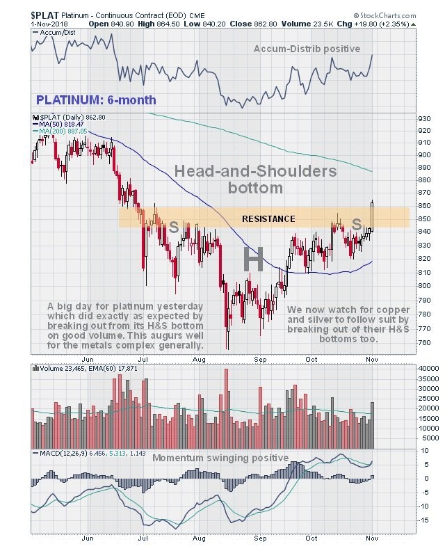 It was a very good day for the metals Friday, as they rose sharply in response to the dollar going into reverse after a sizable run-up. A very significant development was that platinum broke out of its Head-and-Shoulders bottom on strong volume, a move which we had expected that marks the start of a bull market. Copper, gold and silver also rose with silver having a particularly strong day, and although copper and silver have yet to break out of their Head-and-Shoulders bottom patterns, the breakout by platinum is a sign that they will follow suit and break out soon. We can see the breakout by platinum out of its fine Head-and-Shoulders bottom on its latest 6-month chart below.