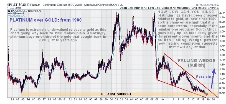 An important point to make at this juncture is that platinum is VERY GOOD VALUE HERE. Our very long-term chart showing the platinum price relative to gold, reveals that it has never been cheaper relative to gold. Gold will buy more than three times as much platinum as it did just over 10 years ago back in 2008. You have to go back as far as 1982 to find a time when platinum was almost as cheap relative to gold as it is now. What this means, of course, is that is that there is a high probability that platinum is going to outperform gold going forward, and so if gold is in a bull market, as expected, platinum should perform even better. Another potential big driver for the platinum price is that, because 70% of it is produced in South Africa, a country whose leaders are determined to make the place end up like Zimbabwe, there could be serious supply disruptions if anarchy prevails. Note the pronounced bullish Falling Wedge on the chart for platinum relative to gold, which strongly supports the contention that platinum is set to outperform.