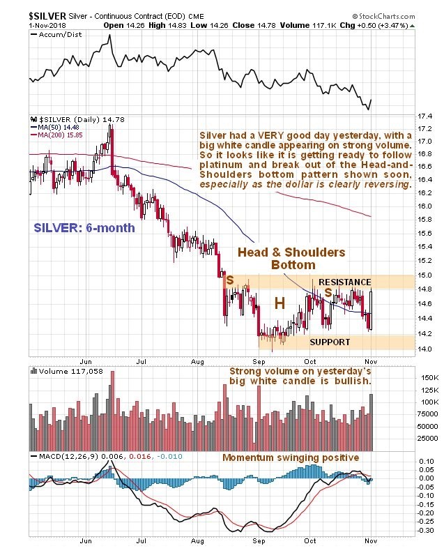 We'll end with a quick look at silver, where we see on its latest 6-month chart that although it didn't break out of its Head-and-Shoulders bottom yesterday like platinum did, it had a big up day with a large white candle on strong volume, which is very bullish and a sign that it is getting ready to break out.