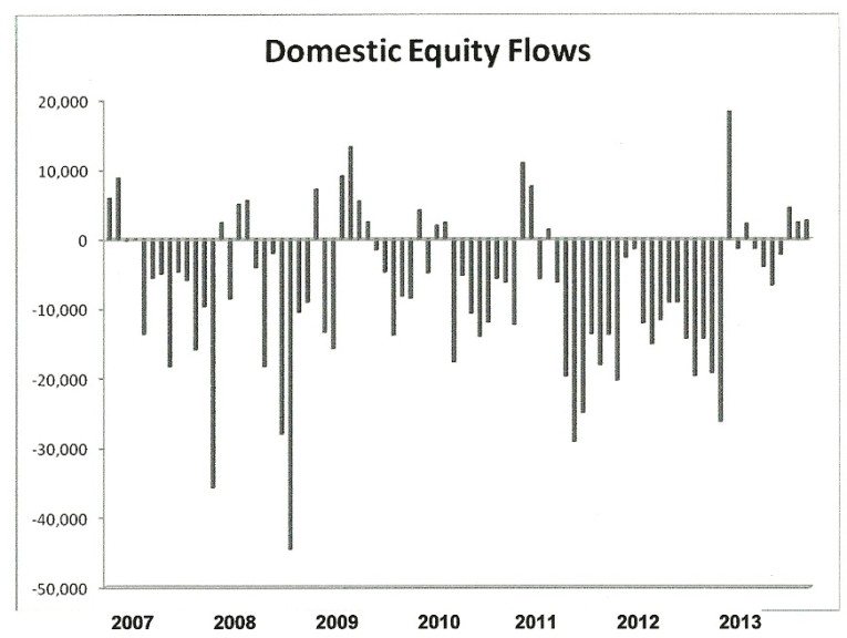 While there was a sharp inflow into equity funds at the beginning of this year, since then the flows have greatly diminished and in some cases have even gone negative. For example, during a 2-week period in 5-12 when bond fund outflows totaled $24.4 billion, equity fund inflows actually had net outflows of $2.0 billion. Domestic equity flows for the week ended July 31 were also negative by almost $1.0 billion. Meanwhile the exodus from bonds and bond funds continues apace with no corresponding return to stocks or equity mutual funds. Clearly the “Great Rotation” Wall Street is hoping for hasn’t happened yet.