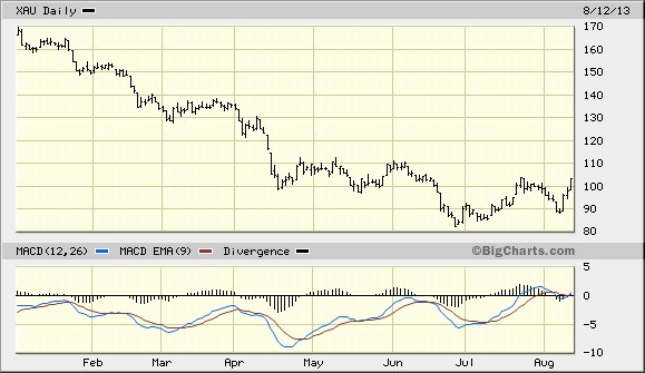 If the XAU succeeds in following through in the coming days by pushing above the nearest high of 103 on a closing basis (the July 23 closing high) then we’ll have our first confirmed instance this year of a higher low and a higher high. In other words, we’ll have the beginnings of a genuine turnaround as opposed to another “dead-cat bounce.”