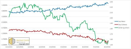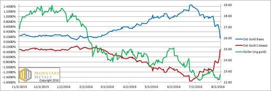 For each metal, we will look at a graph of the basis and cobasis overlaid with the price of the dollar in terms of the respective metal. It will make it easier to provide brief commentary. The dollar will be represented in green, the basis in blue and cobasis in red.
