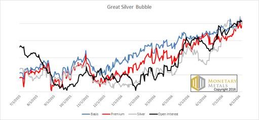 The basis and our calculated premium bottomed and began their current rise around late November. The price of silver began moving up a bit later, around mid-January. And open interest bottomed in late January (it is subject to other factors, such as bank credit availability). Since then, a great bubble has been inflating, with a small leak in May.