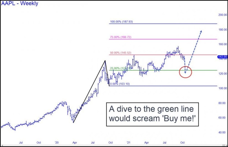 A few forecasters had precisely predicted a potentially important top at or very near $157, including your editor. Some of us even profited from put butterfly spreads purchased a month earlier that more than quintupled in value with AAPL's 12% drop so far. But it could be pressing one's luck to hold out for more, since the downtrend seems to be struggling increasingly and made no progress at all last week. Perhaps the selloff will turn nasty in the week ahead. But if so, keep in mind that a plunge to the green line would actually be bullish, tripping a 'mechanical' buy signal based on Rick's Picks' proprietary Hidden Pivot Method. It would also imply an eventual rally to as high as 187.93.