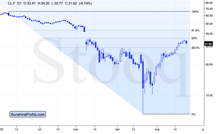 Still, it’s not a proof that the next sizable decline is already underway – not yet. The close below the 38.2% Fibonacci Retracement would make subsequent declines very likely, but given that the 50% retracement and the intraday, mid-March highs were not reached, it seems that crude oil could still launch another intraday rally before truly topping.