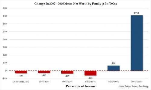 In a nutshell, here is a graph that summarizes everything you need to know about the unsustainable US economy. Unless you’re in the top ten percent of income producers in the nation — or, at least, living in their neighborhood — you are living in a dingy bedroom economy that has only seen its net worth decline since the Great Recession began. Those who are in the top ten percent, on the other hand, profited astronomically from the Great Recession. It’s the best thing that ever happened to them, and you helped them do it with tax-backed or even tax-funded bailouts and by allowing them a perpetual cycle of savings on their capital gains.