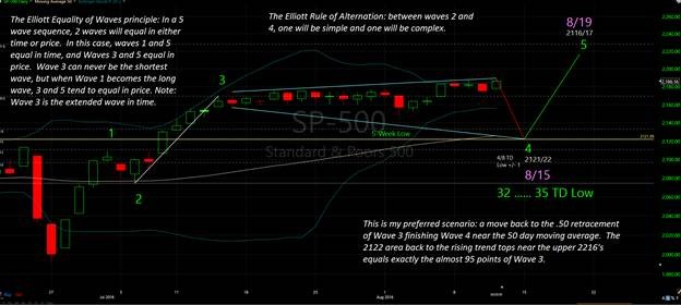 The astro/cycle/wave read between now and August 15th looks for a quick abrupt air pocket of close to 3% in the SPX. At first I was looking for a Wave 4 pullback to 2132/33 by late Friday. However upon re-examination, I believe it will be more in the order of 2122 by Monday. Normally, lows in the market don’t go past the moon in Sagittarius (late Thursday –Saturday), but I have to remind myself of Uranus Retrograde: expect the unexpected.