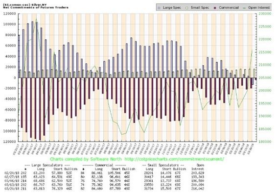 If the latest COT report for silver gets any more bullish than the one released on March 23rd, commercial traders will have to go ‘net long!’ As it is, they reduced their ‘net short’ position to the lowest number in many years, down to just 4,000 contracts – barely 2% of the total open interest! This is bullish action! As recently as January 16th the number of ‘net short’ positions was 50,000, and the percentage of open interest was 26%. (Charts are courtesy Goldchartsrus.com unless specified).