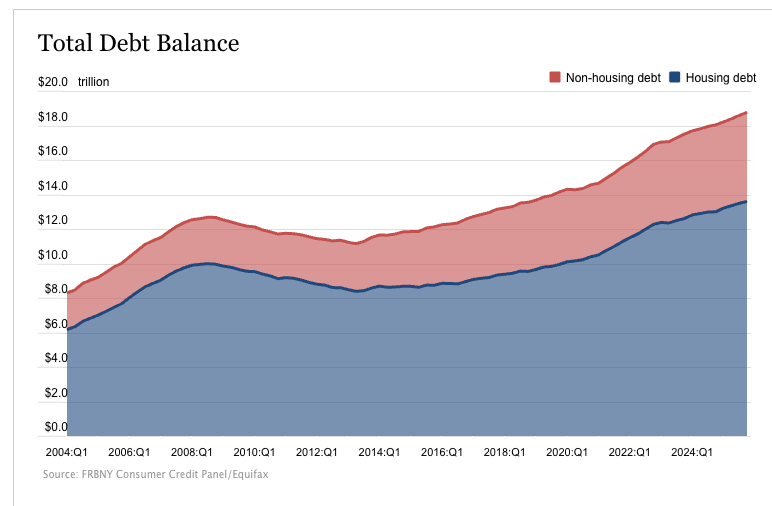The Debt Black Hole keeps getting bigger. Household debt grew modestly in the fourth quarter of 2025, ending the year at another record high. According to the latest data from the New York Fed, household debt grew by $191 billion in Q4, a 1 percent increase. That pushed total household debt to $18.8 trillion.