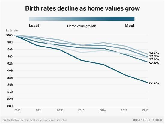 The company recently looked at the changes in values and birth rates in several counties in the United States between 2010 and 2016. It concluded that a boost of 10 percentage points in home values was associated with a drop of 1.5 percentage points in the birth rate among 25- to 29-year-old women.