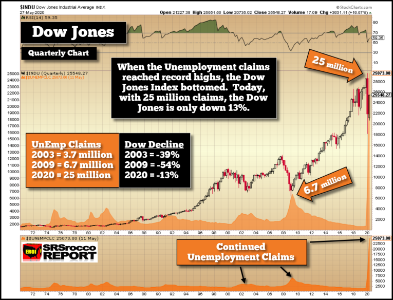 When the continued unemployment claims reached a peak in 2009, the Dow Jones Index had fallen 54% from its highs in 2007. On the other hand, today, with 25 million Americans receiving unemployment insurance, the Dow Jones is only down 13% from its high.