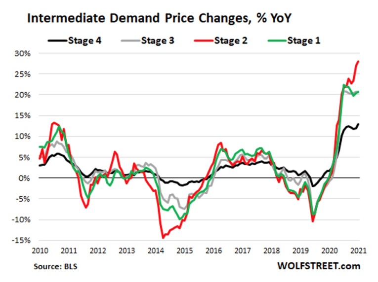 At Intermediate Demand Stage 1 industries, furthest up the pipeline, whose production creates the inputs for industries in Stage 2, prices exploded by 20.8% year-over-year (green line), according to the Bureau of Labor Statistics today. At Stage 2 industries, which create the inputs for industries in Stage 3, prices exploded by 28.1% year-over-year, the worst in the data going back to 2010 (red line). At Stage 3 industries, which create the inputs for Stage 4, prices exploded by 20.6% year-over-year (gray line). And at Stage 4 industries, which create inputs to Final Demand, prices shot up by 12.9% (black line):