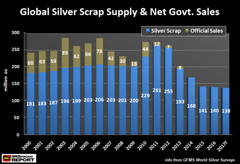 In 2007, total Official Silver Coin sales only totaled 45 Moz, but this number surged to 135 Moz in 2015. From 2007 to 2017f (f = forecast), Official Silver Coin sales totaled 1,045 Moz (1+ billion oz). If we include the official coins sold since 2000, the grand total is nearly 1.3 billion oz. Now, what is important to understand about the 1.3 billion oz of Official Silver Coin sales is that this investor inventory will likely never be recycled as scrap to supply the market. Furthermore, the majority of the 1-100 oz silver bars will never be recycled as scrap either.