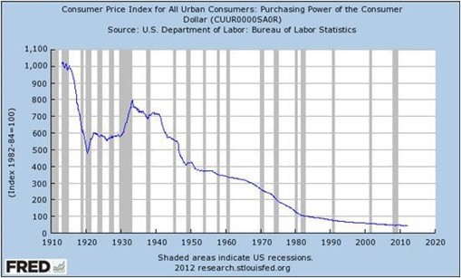 And the big one: Who in their right mind would tie up money for five years in this world, let alone 100? Here’s a chart of the dollar’s value over the previous century: