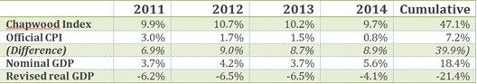 The Chapwood number in the table is the simple arithmetic average of the 50 cities. The year-in, year-out 10% inflation rate is notable. Furthermore, Chapwood shows cumulative inflation rate as shown by the CPI for the four years to be understated by 39.9%, and using Chapwood numbers in place of the GDP deflator, real GDP has slumped a cumulative total of 21.4% over the four years.
