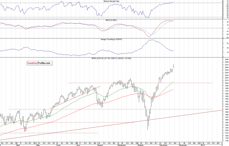 The U.S. stock market indexes gained between 0.2% and 0.5% on Friday, extending their recent uptrend, as investors reacted to some better-than expected economic data announcements. The S&P 500 index has managed to reach yet another new all-time high at the level of 2,071.46. Potential resistance level is at around 2,080-2,100. On the other hand, the nearest important level of support is at 2,050-2,055, marked by previous resistance level, and the next support level is at around 2,040. There have been no confirmed negative signals so far, however, we can see overbought conditions accompanied by negative divergences: