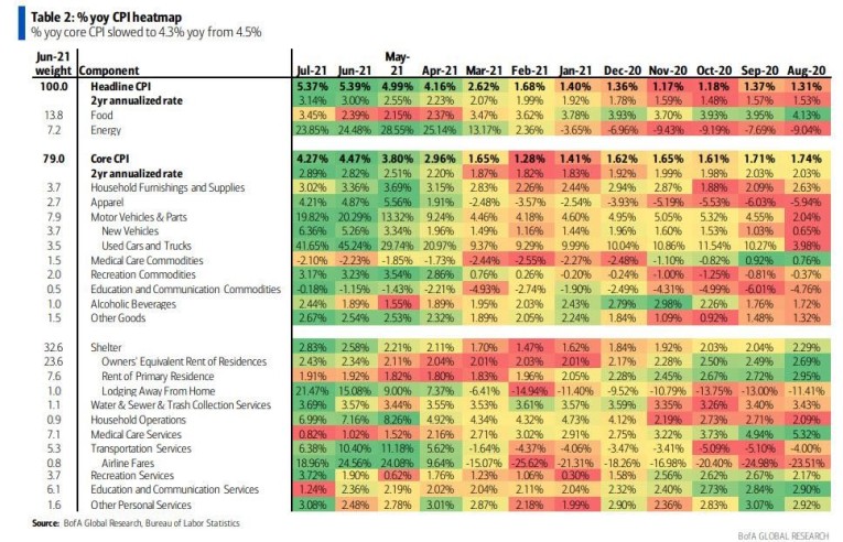 According to BofA – and judging by the market’s delighted kneejerk response – this month revealed significant cooling in transitory inflation. First on the goods shortages theme: used car prices edged up 0.2% mom, even though new cars were much stronger at 1.7% mom.