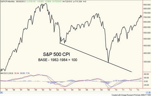 The rally that got underway in March 2009 nominally is up 165% . On an inflation adjusted basis the S&P 500 is up only 110% (to the end of September 2013 only. The October CPI is not due out until later in November). Inflation has taken away quite a bit of the rally. The 2002-2007 rally nominally gained 105% but the inflation-adjusted gain was only 63%. Once again inflation took a big bite out the gains. What about the downside? The nominal collapse in the 2000-2002 bear market was 51% but the inflation adjusted drop was only 48%. The nominal 2007-2009 collapse saw the market fall almost 58% but the inflation adjusted decline was only 53%. Inflation eased the pain of the collapses slightly but took a significant bite out of the rallies.