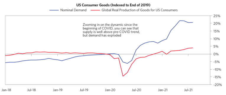 In our letter, “The Inflation Strategy that Works 100% of the Time,” we discussed the extreme demand rotation during Covid that created a chain of supply bottlenecks in the economy: