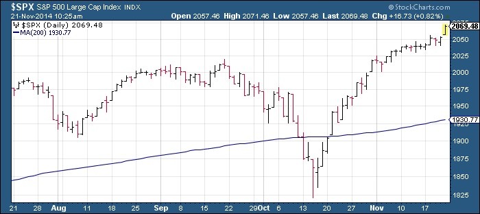 It’s easy to see that investors are almost uniformly bullish with hardly any bears to be found, and that’s a condition that normally doesn’t long persist without a market pullback. Whether the next market “correction” takes the form of a short, sharp decline or a lateral consolidation (i.e. trading range) is open for debate, though. Internal momentum is still running strong, though, which should prevent a sell-off of the magnitude we saw in late September/early October. Instead, the market’s next correction phase could be surprisingly shallow or perhaps even take the form of an internal correction where a few high-profile stocks get shot down while the major averages remain buoyant.