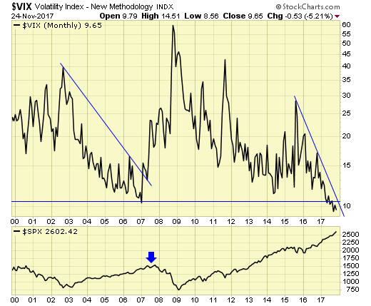 VIX has now made a new low, and when (not if) the downtrend is broken on a monthly basis, investors should consider hedging or under weigh in equity holdings.