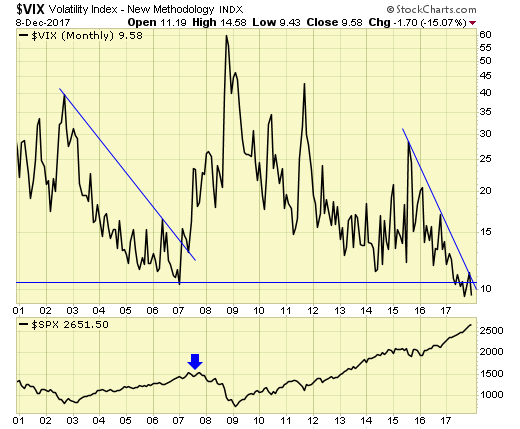 VIX has now made a new low, and when (not if) the downtrend is broken on a monthly basis, investors should consider hedging or under weigh in equity holdings.