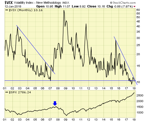 VIX has now made a new low, and when (not if) the downtrend is broken on a monthly basis, investors should consider hedging or under weigh in equity holdings.