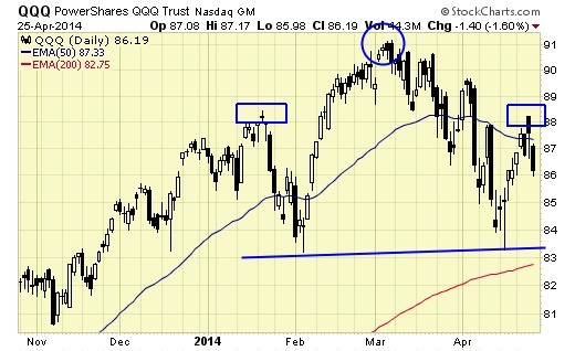 The cube is tracing out a text book perfect “head & shoulder” topping pattern, which will be confirmed if and when the neckline support near $83 is violated.