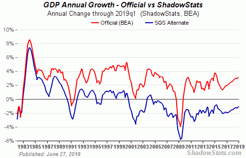 And that is why I say “It’s been a great recession” because we never actually left the Great Recession. Rather than the longest expansion in US history, we’ve been enduring the longest recession in US history ever since the dot-com bust. The above chart shows the GDP growth rate, and the REAL GDP “growth” rate, which has actually been contraction, not growth, for the past two decades if measured by historic standards. So long as GDP is growing, (above 0 on the chart above), we’re in expansion. Whenever GDP is shrinking (below 0 on the chart above), we’re in recession.