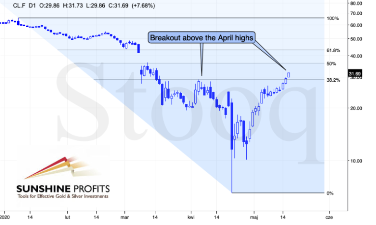 The next upside target is the 50% Fibonacci Retracement level, which coincides with the mid-March top. However, if the breakout above April highs is invalidated, crude oil could decline all the way down to the $20 level or so, before pausing or bottoming.
