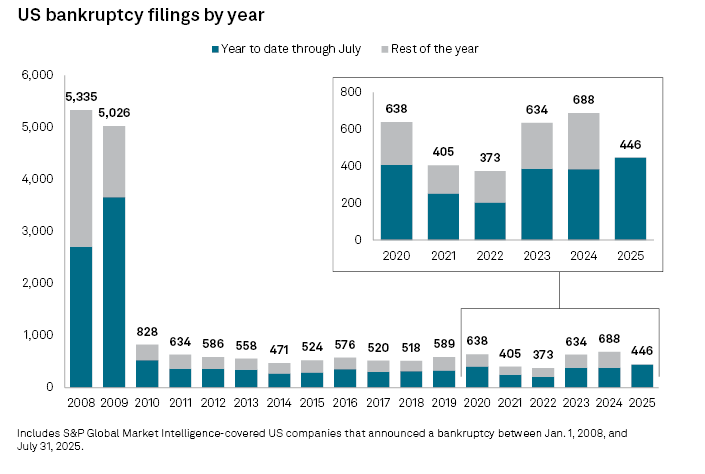 Through the first seven months of 2025, 446 companies filed for bankruptcy. That was the most for any 7-month period since 2010, in the midst of the Great Recession.