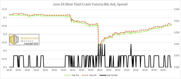 That’s what corrected this extraordinary situation. They could sell their spot metal, and buy a contract to recover exactly the same position. Selling spot presses the spot bid, and buying futures lifts the future ask. It is interesting that the decarry was lower, after the flash crash. This shows the fingerprints of the decarry arbitragers.