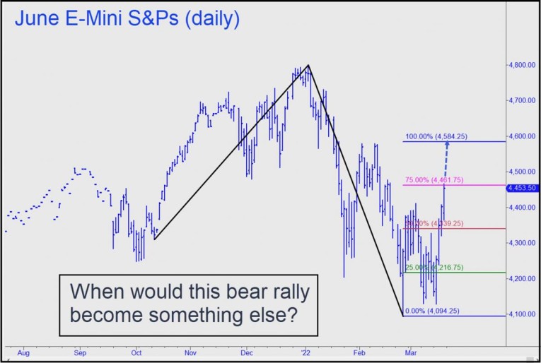 And scary they are -- so much so that the potentially world-shaking geopolitical disaster in Ukraine ranked only seventh on one well publicized list of Americans' biggest concerns. With such a formidable catalogue of troubles, it seemed more than a little plausible that the powerful selloff of stocks that began on January 4 was the start of a bear market. That is still what many, including some of my most astute guru colleagues, seem to believe. We were pretty cocksure about this when the S&P 500 dove 600 points, or 12%, in the first three weeks of the year. When a powerful bear rally intervened in late January/early February, most of us stood our ground; and then we doubled down on costless certitude when stocks began to plummet anew at the end of February. Now they are thrusting sharply higher again, pushed by intense short-covering that reeks of stupidity. And yet, if the stupidity continues for just a few more days, stocks will reach a threshold at which bearish certitude -- or at least mine -- will begin to wither.