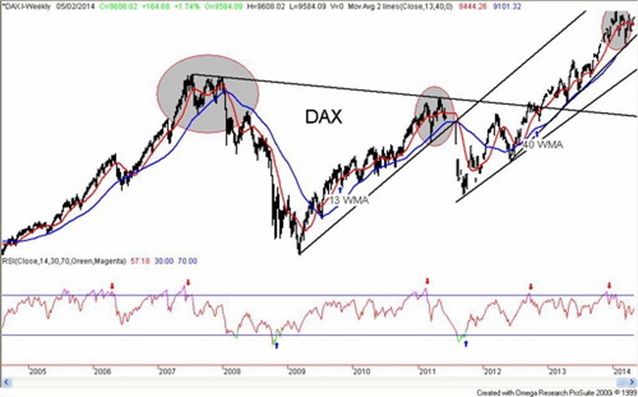 The DAX may be worth keeping an eye on. The current pattern forming on the weekly chart is eerily similar to one that formed in 2007 and again in 2011. The DAX has been following a trendline up that is parallel to the trendline that formed from 2009-2011. The DAX recently broke below its 13 week MA but managed to rebound back off the 40 week MA. The DAX RSI indicator has turned down from overbought levels just as it did in 2006, 2007 and 2011 (down arrows on the RSI).