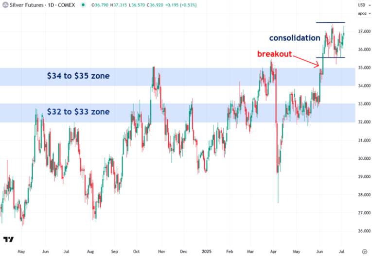 About a month ago, silver finally broke out above two key resistance zones that had capped its gains for the past year: first the $32–$33 zone, and then the $34–$35 zone. This breakout is a strong indication that silver’s bull market is gaining momentum.