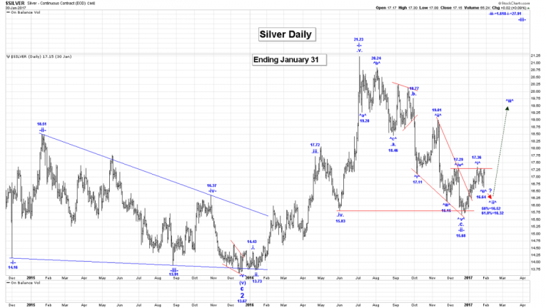 We can now conclude that all of wave ^i^ of .i. of -iii-, is complete at the 17.36 high and that we are now falling in our expected wave ^ii^ correction, as shown on the Daily Silver Chart, As with our comments on gold, it might be possible that all of wave ^ii^ is complete at the 16.64 low.