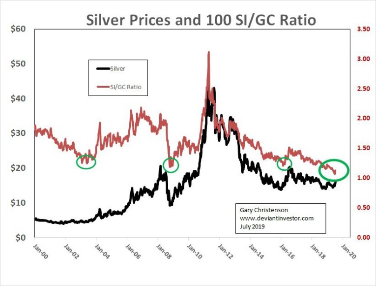 The silver to gold ratio is about 0.11, historically low, and primed to correct higher. This ratio provides long-term guidance for silver purchases.