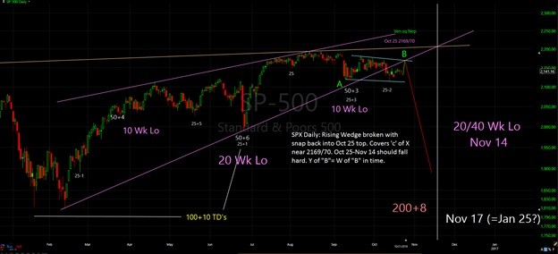 The e-wave notations on the SPY chart suggest a bearish inverted WXY “Y” wave with a “Z” wave to come. The “Z” wave subdivides ABC. We are almost through with Wave B (wave y of B, October 25th near 2169?) and as you can see on the SPX chart below it is snapping back to the large Rising Wedge pattern. Waves w and y of B look to be equal in time (a rally of 8 trading days), which fits the Equality of Waves Principle.