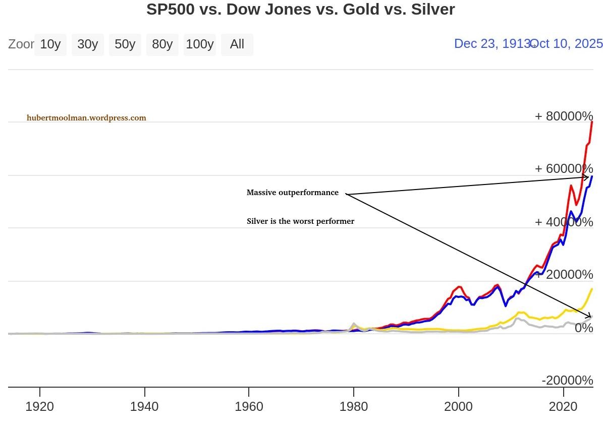 The S&P 500 is in red, the Dow in blue, and gold and silver in their native colours. The stock market has significantly outperformed precious metals, with silver being the worst performer.