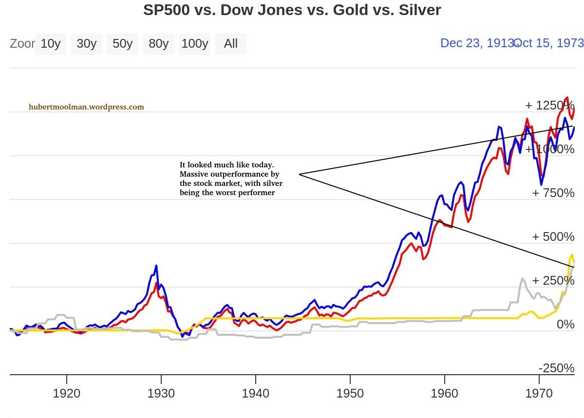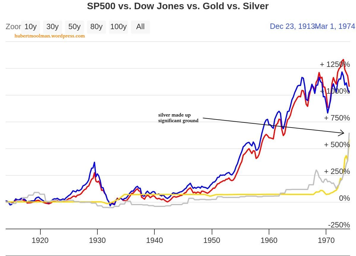 This is how silver measured against the Dow, S&P 500, and silver at that time (October 1973):