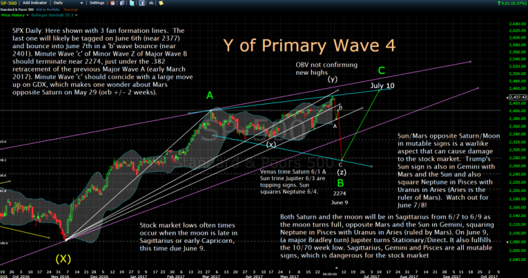 Last week I was looking for a pull back into May 31’s 8 TD low.  Howeve, the move down was extremely shallow (wave ‘b’ 2418 down to 2403) -- and wave ‘c’ of Y looked to have finished on June 2 (or will finish by June 5 near 2440).  The trines of June 1 (Venus trine Saturn) and June 3 (Sun trine Jupiter) are usually found near tops.