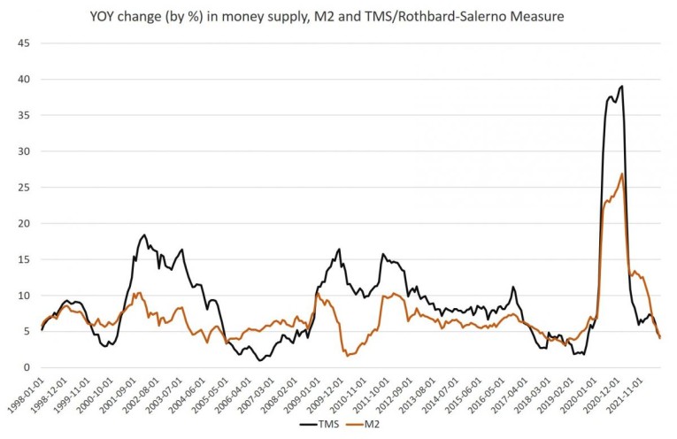 The money supply metric used here—the "true" or Rothbard-Salerno money supply measure (TMS)—is the metric developed by Murray Rothbard and Joseph Salerno, and is designed to provide a better measure of money supply fluctuations than M2. The Mises Institute now offers regular updates on this metric and its growth. This measure of the money supply differs from M2 in that it includes Treasury deposits at the Fed (and excludes short-time deposits and retail money funds).