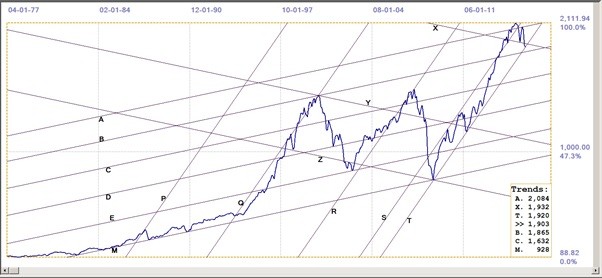 Symmetrical channel PQRT is of interest. The SP500 closed on line T in February 2009 and at that point it may have been concluded that the SP500 could break lower, as fundamentals were very poor at the time. Instead, after the US Fed injected trillions of dollars into the financial system, the steep bull market took off, and, in doing so, maintained the same gradient that has been associated with rising trend for quite some time. The Fed’s timing was exquisite, having the SP500 reverse higher off support from the master line M, and starting the steep bull market in channel ST at just the right moment to fit the channel ratios!!
