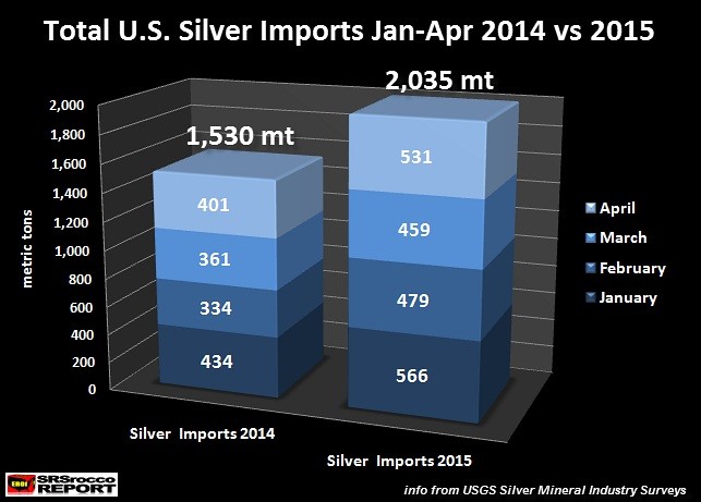 The data above was just for the first two months of the year, but nothing really changed in U.S. silver demand during March or April to account for 33% more silver imports. If this trend continues, the U.S. will import over 6,000 mt of silver in 2015.