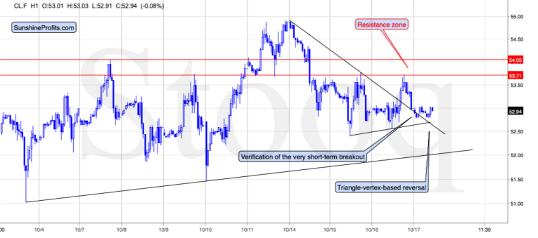 Indeed, crude oil moved higher after the above moment, but based on a big pre-market decline in the USD Index, crude oil was able to rally to only 53.30. This means that it was not able to even get back to its recent high. This is a very bearish sign and one that almost makes us open a short position right away.