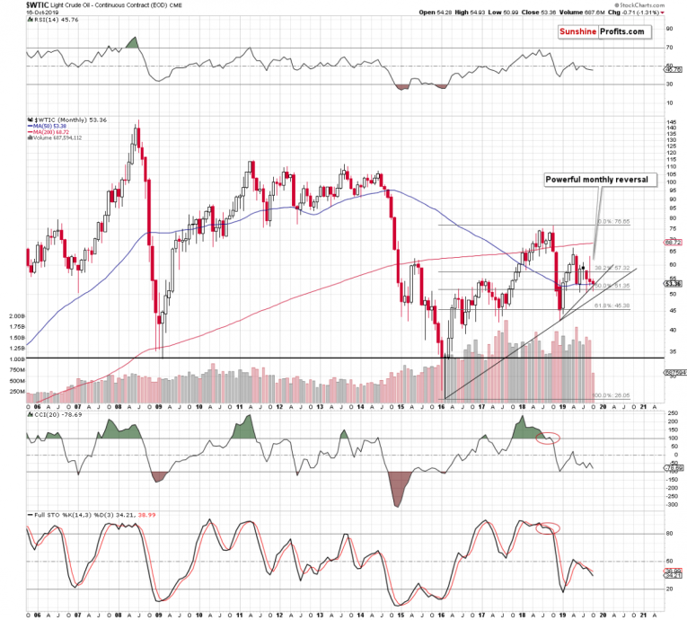 Crude oil reversed in a profound way in September, which suggests that lower prices are likely in the following months. The sell signal from the monthly Stochastic indicator also remains intact. That’s in tune with the same indicator on the daily timeframe. The outlook is simply not as bullish as it used to be in the previous days.